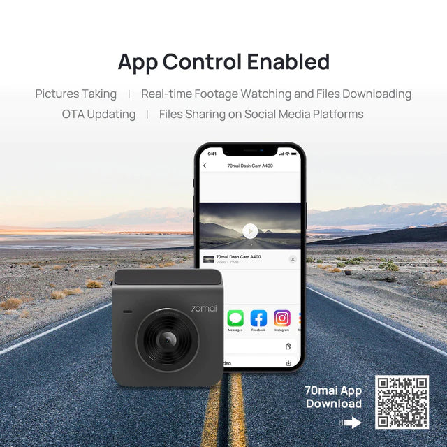 Gracias al Wi-Fi integrado que posee la 70mai a400, es posible conectarse a la aplicación compatible para ver fotos en vivo, reproducir videos grabados y descargar archivos en el teléfono. Además, esta función permite actualizaciones OTA continuas, corrigiendo de esta manera errores automáticamente y actualizando el software constantemente.