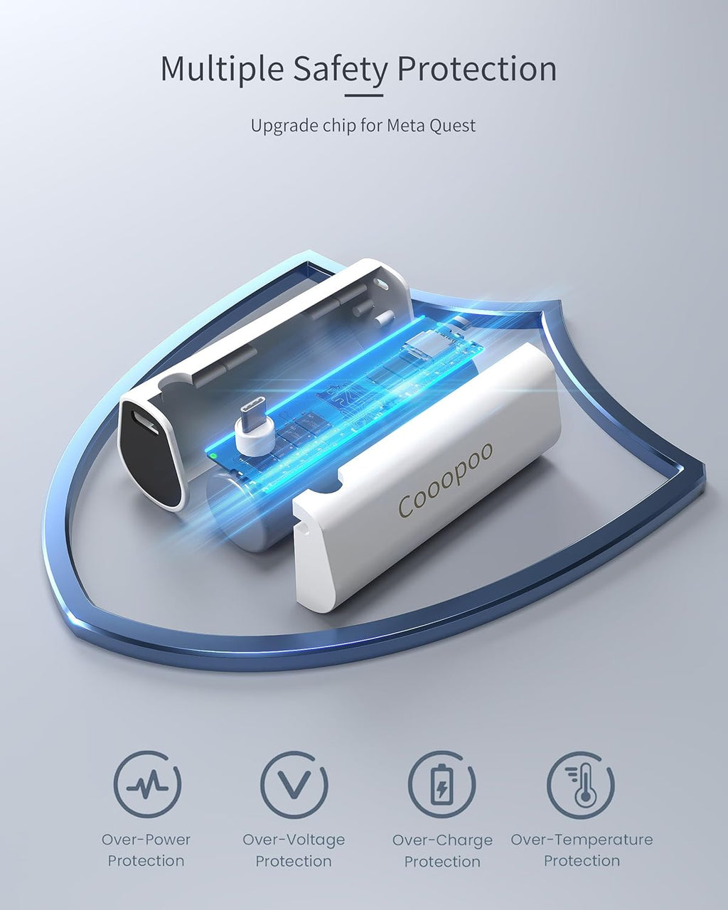 - La alimentación de 5 V 3 A ofrece una velocidad de carga más rápida que otras baterías, lo que garantiza el óptimo funcionamiento de tus auriculares Quest.