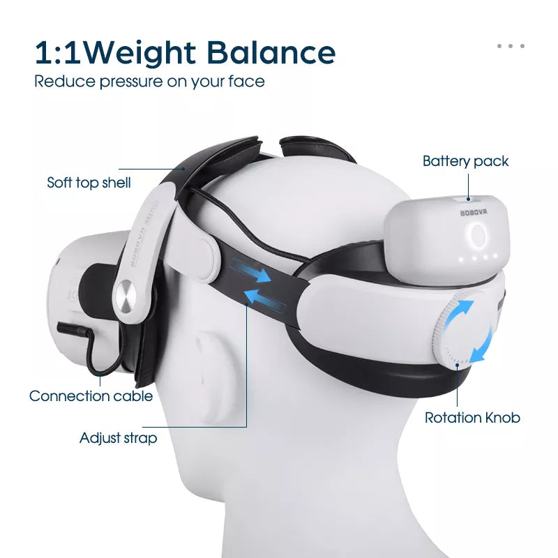 BOBOVR M2 Pro es una correa para gafas vr diseñada para usar en la cabeza con los Oculus Quest 2, cuenta con una batería de 5200mAh con una duración de 2 a 3 horas y también hay una interfaz USB-C. Además de alimentar los lentes vr puede hacerlo con otros accesorios como el BOBOVR F2.