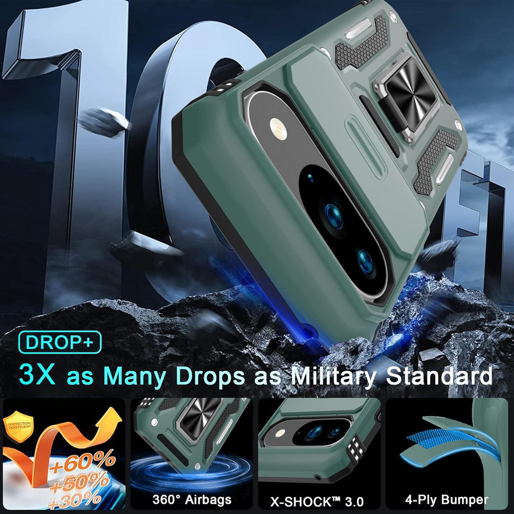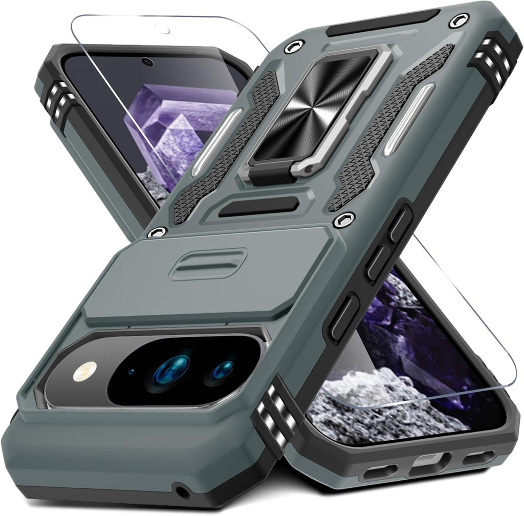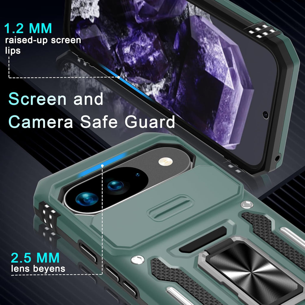 Case for Google Pixel 10/10 Pro with Slide Camera Cover+Screen Protector(1 Pack), Rotated Ring Kickstand Military Grade Shockproof Protective Cover-Green
