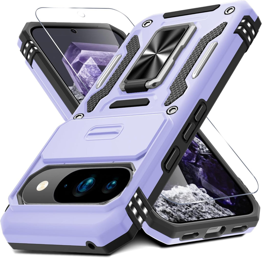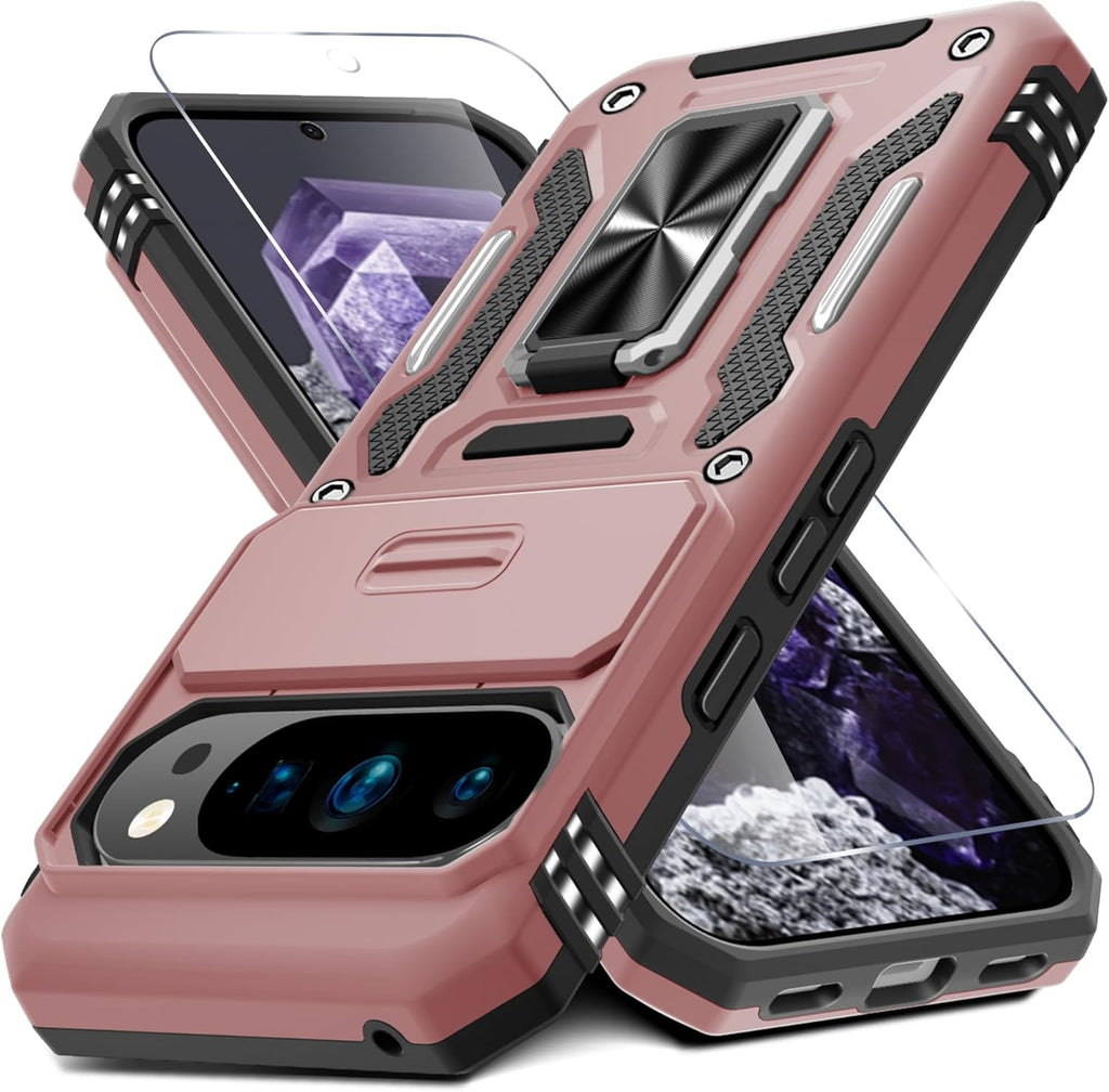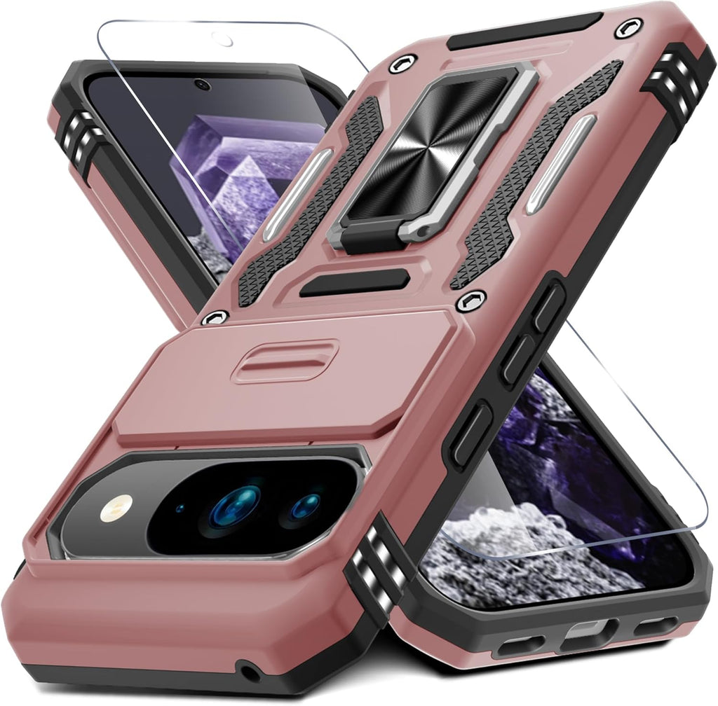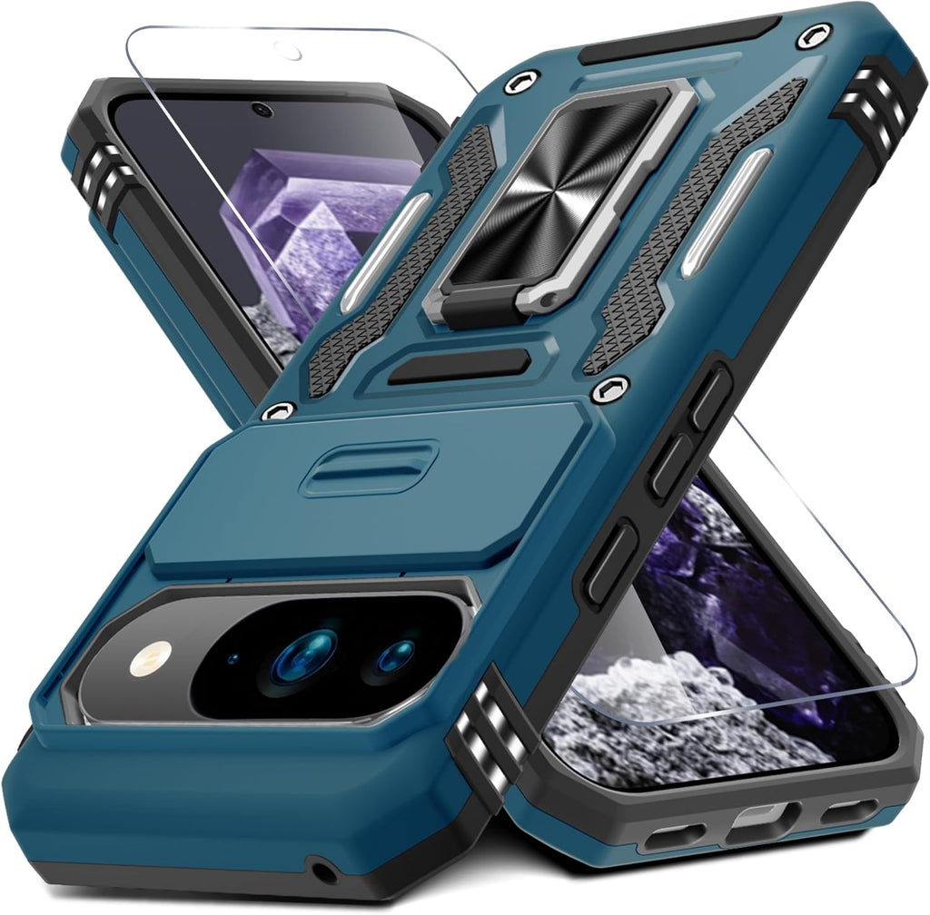Case for Google Pixel 10/10 Pro with Slide Camera Cover+Screen Protector(1 Pack), Rotated Ring Kickstand Military Grade Shockproof Protective Cover-Green