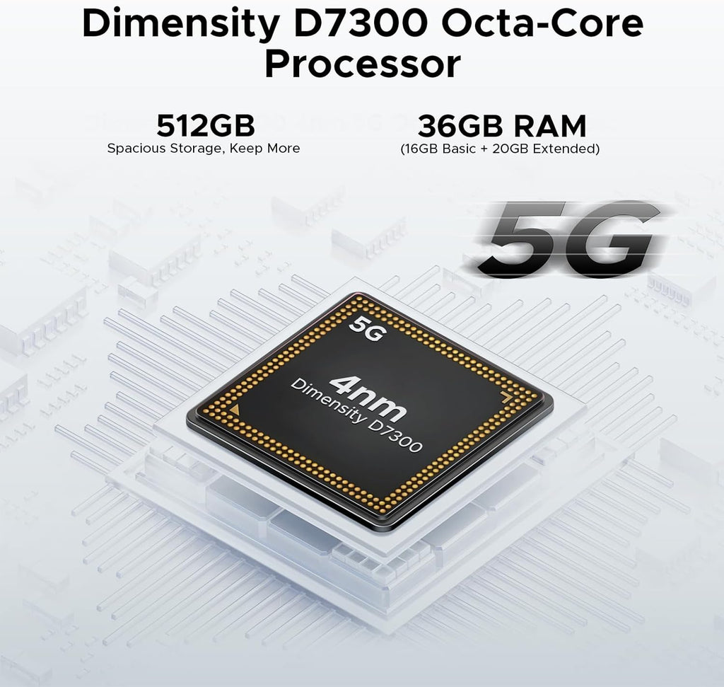 El primer rugerizado con tecnología DDR5. Con 36GB de RAM (16GB físicos + 20GB virtuales) y 512GB de almacenamiento, ofrece un rendimiento 50% más rápido. Multitarea fluida y velocidad extrema gracias al chip Dimensity 7300 (4nm).