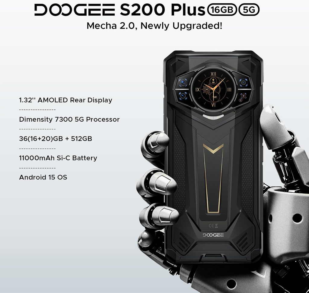 El DOOGEE S200 Plus no es solo un teléfono resistente. Es una bestia tecnológica con Android 15, Pantalla Trasera AMOLED y el procesador Dimensity 7300 de 4nm. Diseñado para dominar cualquier terreno.