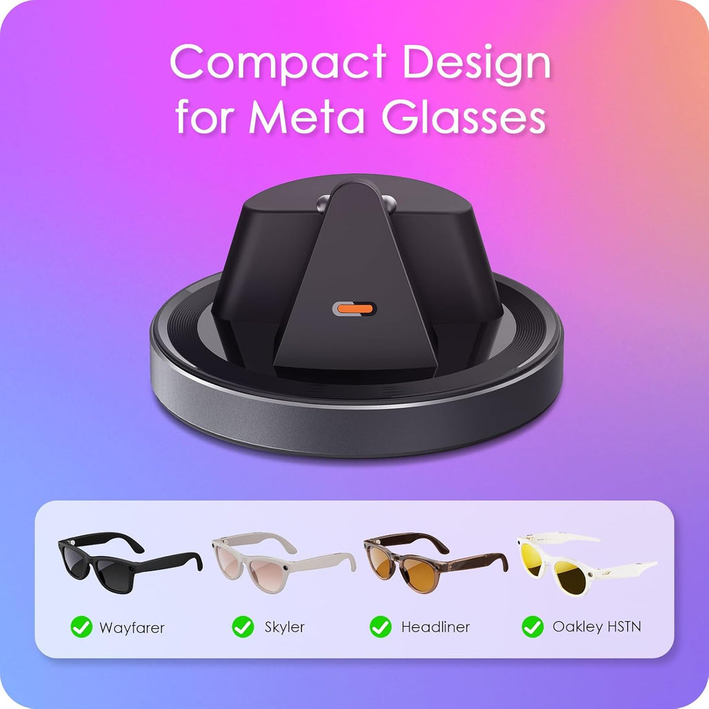 • Ajuste compacto para gafas Meta: Diseñada para los modelos Wayfarer, Skyler, Headliner y Oakley Meta HSTN, esta estación de carga redonda ofrece un ajuste cómodo y fiable en un tamaño compacto, ideal para espacios reducidos, mesitas de noche o interiores de coches.