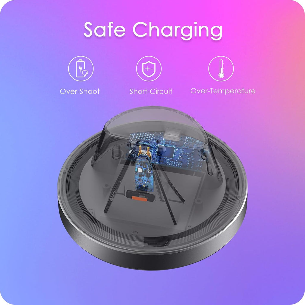 • Base estable con indicador LED: La base circular con peso y adhesivo reutilizable se mantiene firme en cualquier superficie. El LED se ilumina en naranja durante la carga y se vuelve verde cuando está completamente cargada, lo que proporciona un estado claro de un vistazo.