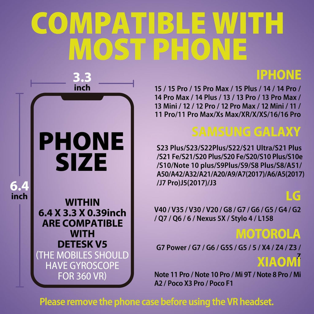 • Retire la funda del teléfono antes de usar las gafas de realidad virtual. MODELOS DE TELÉFONOS COMPATIBLES: las gafas DESTEK V5 VR admiten teléfonos con un SENSOR GIROSCOPIO (TELÉFONO DE 6.4*3.3*0.39 pulgadas L*W*H), como para iPhone 16/16 Pro/iPhone 15/15 Pro/15 Plus/14/14 Pro/14 Pro Max/14 Plus/13/13 Pro/13 Pro Max/13 Mini/12/12 Pro/12 Pro Max/12 Mini/11/11 Pro/11 Pro Max/Xs Max/XR/X/Xs, para Samsung s23 plus/s23/s22 plus/s22/s21 plus/s21 fe/s21/s21 Ultra/s20 plus/s20 fe/s20/S10 Plus/S10e/s10/note 20/note 10 plus/s9plus/s9/s8 plus/s8/A51/A50/A42/A32/A21/A20/A9/A7(2017)/A6/A5(2017)/J7Peo/J5(2017)/J3 (NO APTO PARA iPhone 16 Plus/16 Pro Max/15 Pro Max, Samsung Galaxy S24 Ultra/S23 Ultra/S22 Ultra/S20 Ultra)