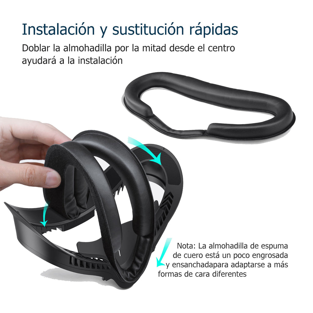 En primer lugar, el set incluye dos almohadillas para la cara. Estas almohadillas están hechas con cuero PU de calidad premium, un material suave y transpirable que proporciona una sensación agradable en la piel. Además, están diseñadas para adaptarse perfectamente a la forma de tu rostro, lo que asegura un ajuste cómodo y seguro durante largas sesiones de juego. Esta almohadillas facial, permite disfrutar de una experiencia de realidad virtual sin molestias ni irritaciones en la piel.