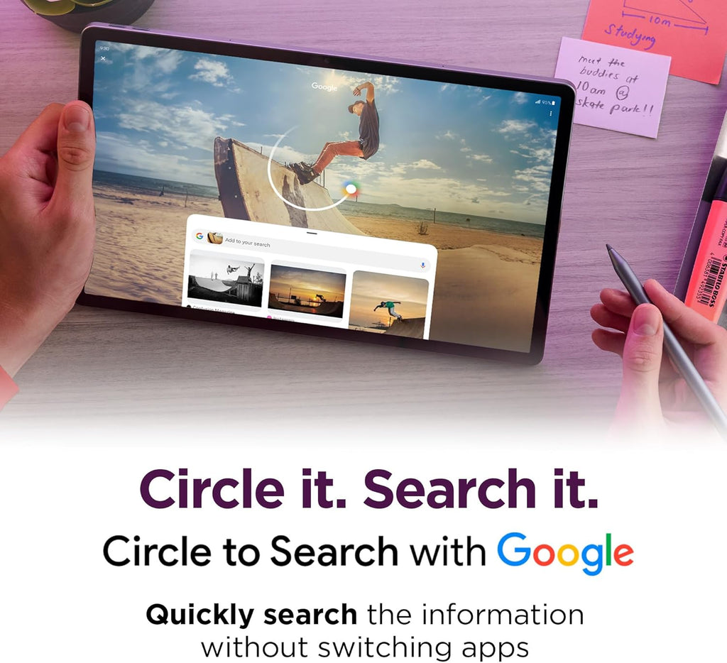 Di adiós a las capturas de pantalla. Presiona el botón de inicio y traza un círculo con tu dedo o el **Tab Pen Plus** (incluido) para obtener respuestas y traducciones instantáneas de cualquier cosa en pantalla.