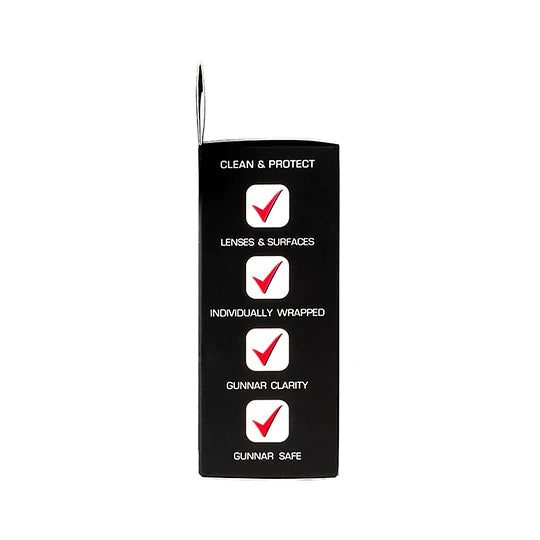 Mantén tus anteojos Gunnar y dispositivos digitales impecables con las Toallitas Gunnar. Cada caja contiene 30 toallitas envueltas individualmente, ideales para tus aventuras diarias. Descubre la elección clara para una limpieza eficiente de pantallas y lentes.