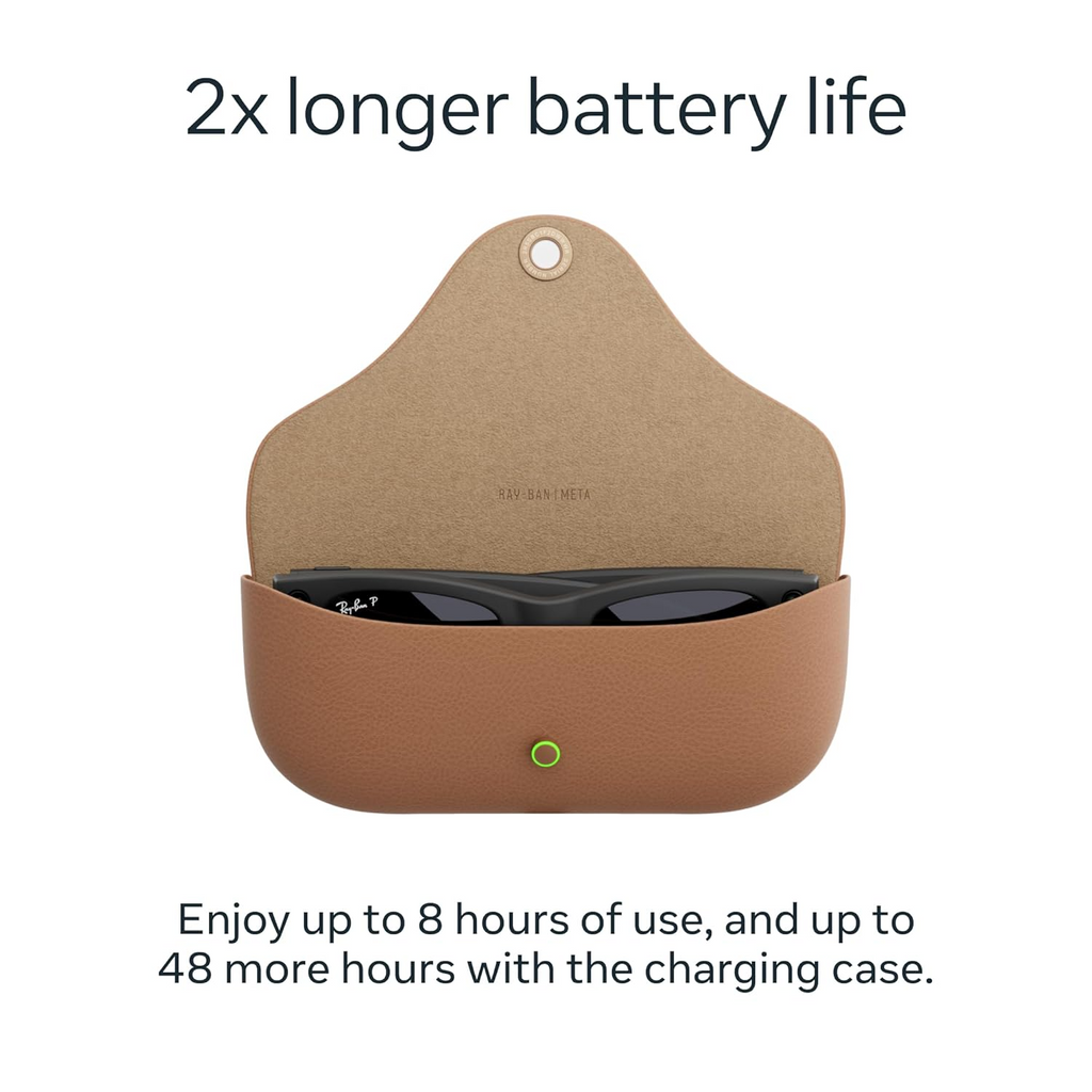 El elegante estuche de carga, inspirado en los originales de Ray-Ban, proporciona hasta 32 horas de autonomía adicional. Las gafas ofrecen hasta 4 horas por carga.
